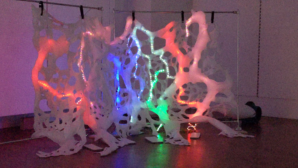 Mycelium Web is a larger-than-life representation of mycelium and their interconnected webs of data. Pressure sensors located in the lower portion of the sculpture trigger light to radial out, mixing color as it connects to other webs of light.